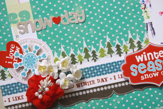 [12インチレイアウト「winter season」] スキー場の雪の白さと空の青さのイメージから、ブルー&ハートのペーパーを選びました。 赤の小物達をアクセントに選び、を選びました。 左下のサークルの上の雪の結晶と右下のタイトルのダイカットは、ともにポップアップしています。