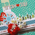 スキー場の雪の白さと空の青さのイメージから、ブルー&ハートのペーパーを選びました。 赤の小物達をアクセントに選び、を選びました。 左下のサークルの上の雪の結晶と右下のタイトルのダイカットは、ともにポップアップしています。
