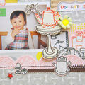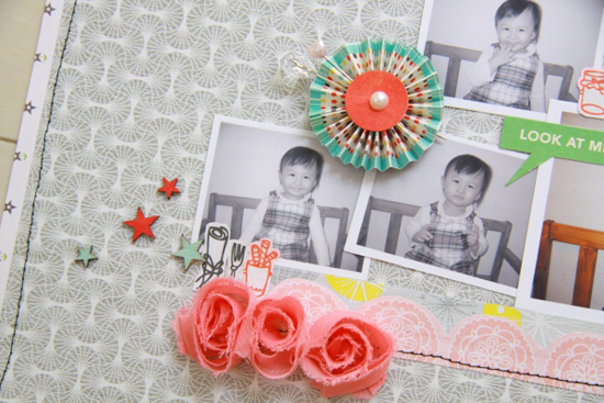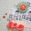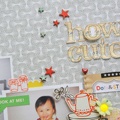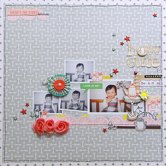 [12インチレイアウト「how cute」] ペーパーの色にあわせてモノクロの写真を使い、メインの写真だけカラーにしました。 色に統一感を出したかったので、写真の中の服の色やペーパーフラワーの配色などから ウッドの星もレッドとブルーで着色して使いました。 カラー写真の横のポットのエンベリなどはパッケージから切り取ったものです。 タイトルのアルファベットはペンでふちどりをし、「O」だけポップアップしています。