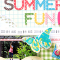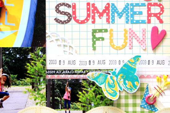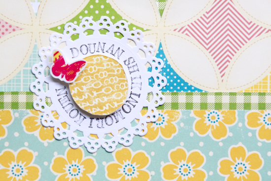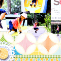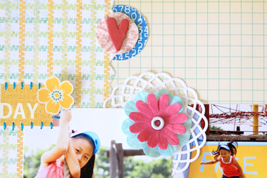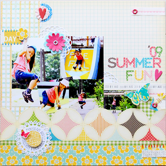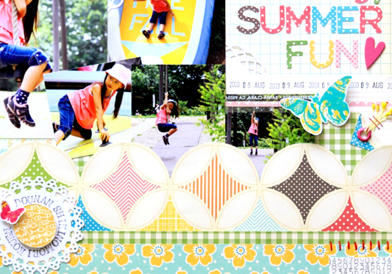 [12インチレイアウト「'09 SUMMER FUN」」] October Afternoonのペーパーがカラフルだったので、写真もカラフルな色の入ったものを選びました。 レースペーパーは大きくもなく小さくもなく、そしてペラペラではなくほどよい厚みがあります。 アクセントにもできるし、ジャーナルにもできるし、切ったり着色したりと色んな使い方ができそうです。 Hamblyのクリアステッカーは無地のペーパーに貼り付けたものを切り取ってから、 お花とハートのチップボードはアクリル絵の具で着色してから使っています。 レースペーパー同様、白ベースのお花も自由に好みの色に着色できるので便利ですね。 そして、Casket*オリジナルペーパーは今回も他のペーパーにすんなりとけこんでくれて、とてもあわせやすかったです。 全体的に、カラフルなのですが色味はやさしくて淡いので、刺繍糸やアクリル絵の具を使用してる箇所は意識して濃い目の色を使用しました。