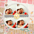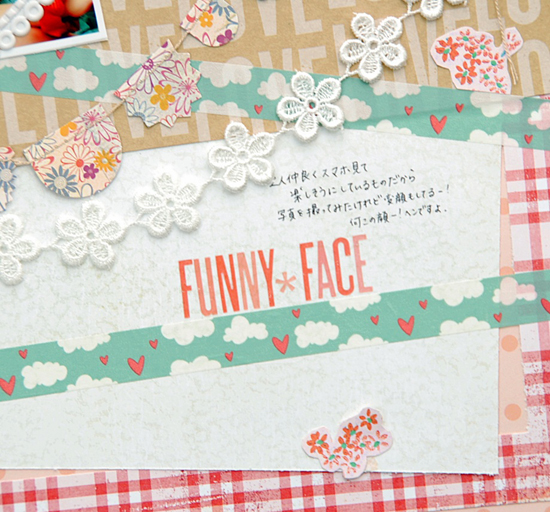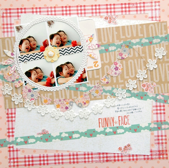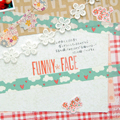 [12インチレイアウト「Funny *Face」] [ Fancy Pants ] Hopscotch / Skippingのペーパーを正方形の枠型にカットし、また抜いた中の部分も裏面を表にして不規則に配置しました。子供のおちゃらけた表情が印象的だったのでレイアウトの雰囲気も楽しさが伝わってくるように努めています。BasicGreyのペーパーガーランドとフラワー形リボンを同じように置き、レイアウトのポイントにしてみました。