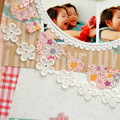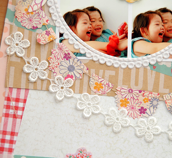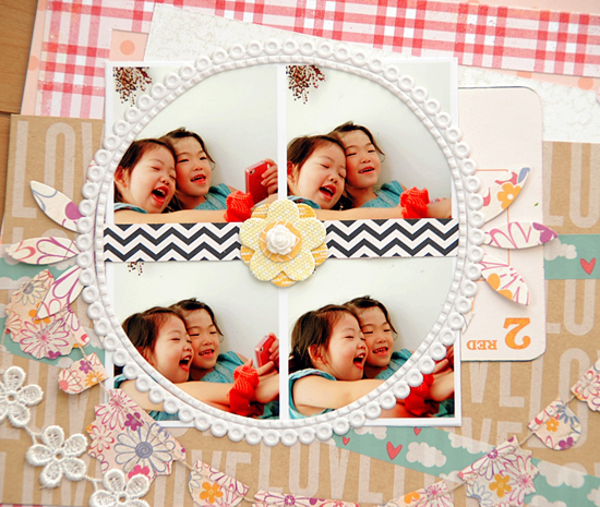 [ Fancy Pants ] Hopscotch / Skippingのペーパーを正方形の枠型にカットし、また抜いた中の部分も裏面を表にして不規則に配置しました。子供のおちゃらけた表情が印象的だったのでレイアウトの雰囲気も楽しさが伝わってくるように努めています。BasicGreyのペーパーガーランドとフラワー形リボンを同じように置き、レイアウトのポイントにしてみました。