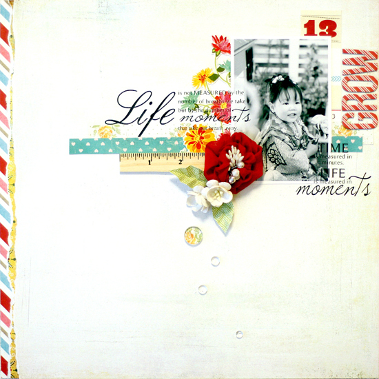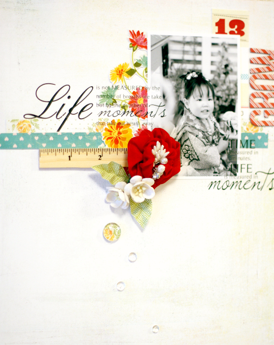 [12インチレイアウト「GROW」] 七五三の着物写真をシンプルかつカジュアルな雰囲気のレイアウトに収めました。 写真はモノクロにプリントし、着物の色とリンクする真っ赤な立体フラワーがアクセントになるように配置しています。立体フラワーに添えられた葉はパターンペーパーをフリーハンドでカットして折り目を付けてボリュームを出しました。写真の左側の花柄はメタルフラワーのパッケージの裏面にプリントされたものをカットアウトし使用しています。