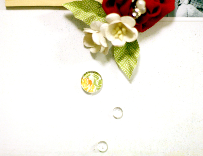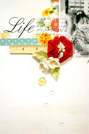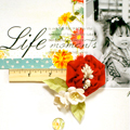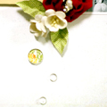 七五三の着物写真をシンプルかつカジュアルな雰囲気のレイアウトに収めました。 写真はモノクロにプリントし、着物の色とリンクする真っ赤な立体フラワーがアクセントになるように配置しています。立体フラワーに添えられた葉はパターンペーパーをフリーハンドでカットして折り目を付けてボリュームを出しました。写真の左側の花柄はメタルフラワーのパッケージの裏面にプリントされたものをカットアウトし使用しています。