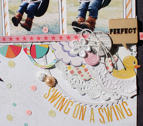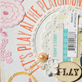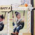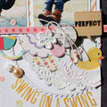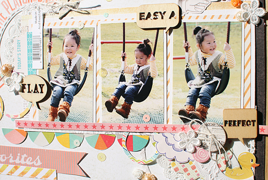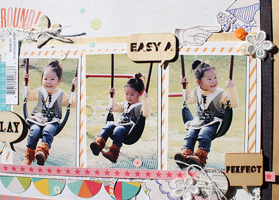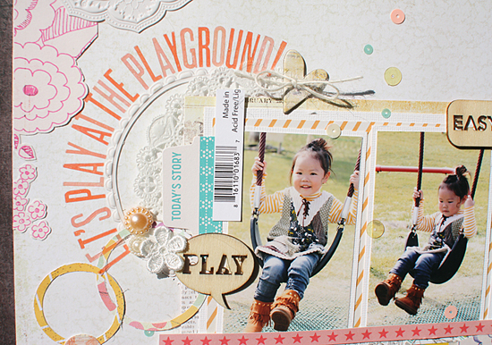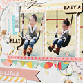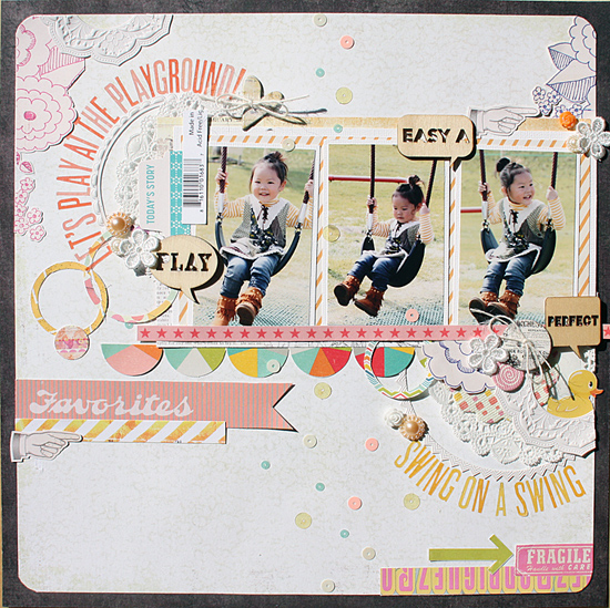 [12インチレイアウト「LET'S PLAY AT THE PLAYGROUND!」] キット内のやわらかいカラーのアイテムを集めてガーリーなレイアウトを作りました。写真周りにはサークルのステッカーをアクセントに パターンペーパーもサークルカッターでリング状にカットして ランダムに散らしています。キット内のTRANSPARENT LETTERS STICKERSとスパンコールの色味がとても良く合っていて、透け感を楽しむことができました。