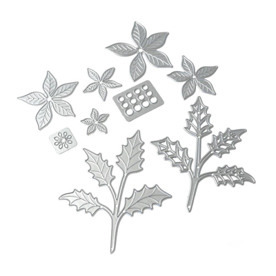 ダイ9個セット。1番大きいダイのサイズ8.1cm×9.8cm。5個のうち1番小さいポインセチアのサイズ約2.5cm。