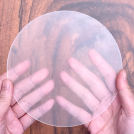 クリアプラスチック。直径約15cm(約6インチ)、厚み約1mm弱。両面に透明保護シートがついていますので剥がして使用してください。(剥がした後は透明です)