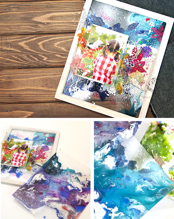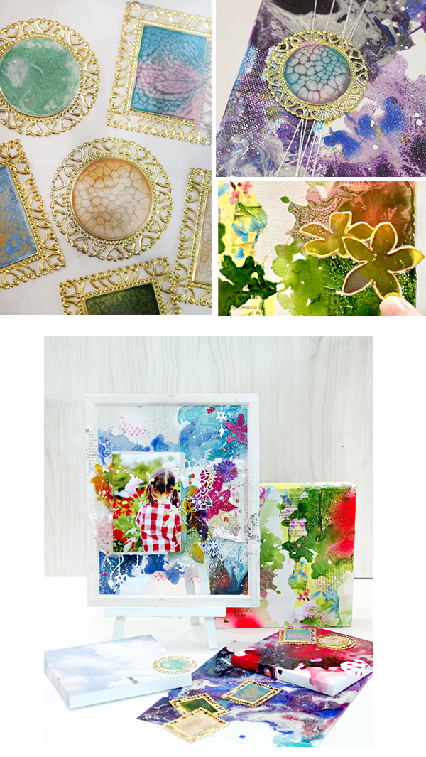 Pebeo画材で色や表現を加えたクリア版を土台にした8×10インチのクリアレイアウトを製作します。サンプルと同じ材料は用意・レイアウトや使用アイテムの説明はしますが色・アレンジは自由なフリークラススタイルとなります。 レース・スタンプ・ペーパー・ダイカット・スパンコール・・お馴染みのアイテムも組み合わせながら仕上げていきましょう・ 併せて東京ではまだ開催のなかったレース染めの体験も少し入れたいと思います。 レイアウトはウッドのフレームにはめ込み仕上げます。