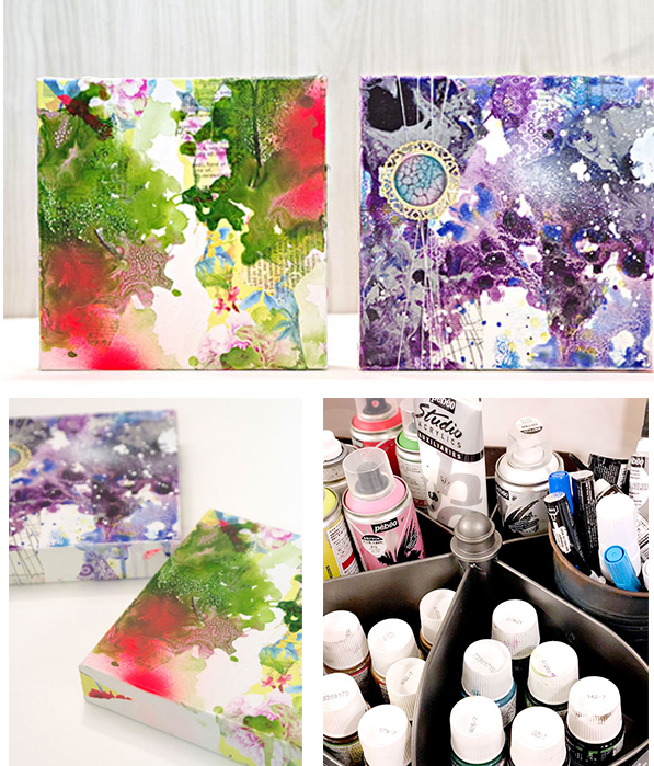 厚さが37mmと存在感・側面にもしっかり表現のできるPebeoの3D張りキャンバスにコラージュやスタンプ・ステンシルを組み合わせながらPebeoの各種アイテムを使いながら色や雰囲気を加えていき、自分だけのアートパネルを制作していきます。