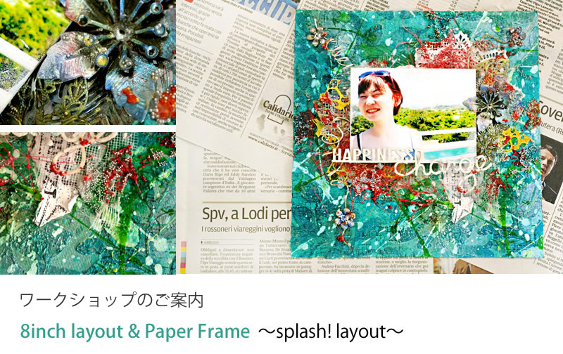 しぶき飛び散る”Splash!”なレイアウトをmixed mediaなアイテムをたっぷり使用して制作します。